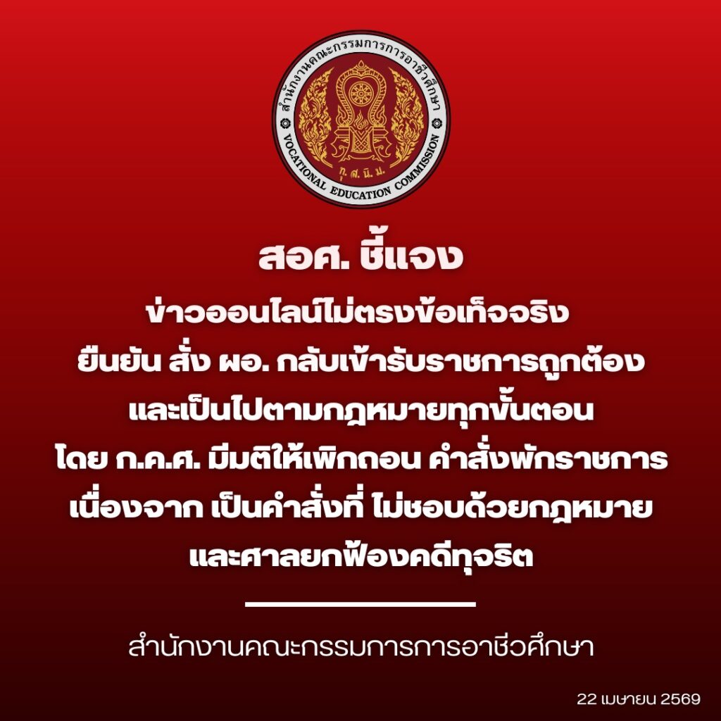 สอศ.ชี้แจงข่าวออนไลน์ไม่ตรงข้อเท็จจริง ยืนยันสั่งผอ. กลับเข้ารับราชการถูกต้องและเป็นไปตามกฎหมายทุกขั้นตอนโดย ก.ค.ศ. มีมติให้เพิกถอนคำสั่งพักราชการเนื่องจากเป็นคำสั่งที่ไม่ชอบด้วยกฎหมายและศาลยกฟ้องคดีทุจริต