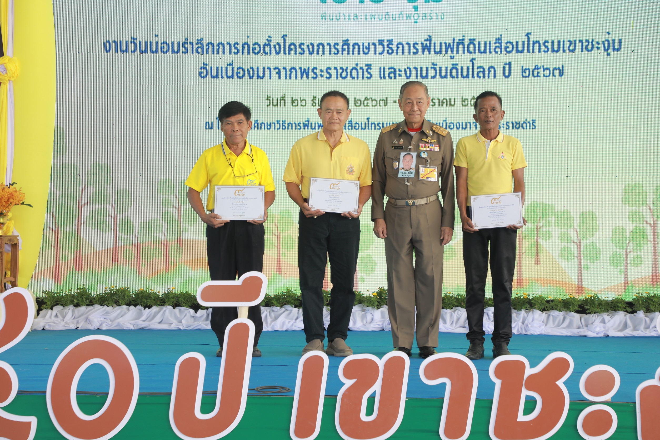 วันที่ 26 ธันวาคม 2567 เวลา 10.00 น. พลอากาศเอก ชลิต พุกผาสุข องคมนตรี รองประธานกรรมการบริหารโครงการศูนย์ศึกษาการพัฒนาอันเนื่องมาจากพระราชดำริ เป็นประธานในพิธีเปิดงานน้อมรำลึกการก่อตั้งโครงการศึกษาวิธีการฟื้นฟูที่ดินเสื่อมโทรมเขาชะงุ้มอันเนื่องมาจากพระราชดำริ และงานวันดินโลก ปี 2567 “4 ทศวรรษ ผืนป่าและแผ่นดินที่พ่อสร้าง” ณ โครงการศึกษาวิธีการฟื้นฟูที่ดินเสื่อมโทรมเขาชะงุ้มอันเนื่องมาจากพระราชดำริ ตำบลเขาชะงุ้ม อำเภอโพธาราม จังหวัดราชบุรี พร้อมมอบเกียรติบัตรแก่เกษตรกรที่ชนะการประกวดเกษตรกรตัวอย่างโครงการ และนักเรียนที่ชนะการแข่งขันวาดภาพบอร์ดกระดานดำ พร้อมกับเยี่ยมชมนิทรรศการภายในงานฯ