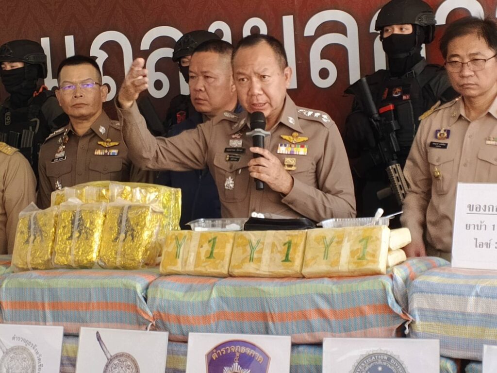 วันที่ 8 พฤษภาคม 2568 ที่สำนัก งานตำรวจภูธรภาค 5 อ.เมือง จ.เชียงใหม่ พล.ต.ท.กฤตธาพล ยี่สาคร ผบช.ภ.5 พล.ต.ต.วรพงศ์คำลือ ผบก.สส.ภ.5 พร้อมเจ้าหน้าที่ นบ.ยส.35, ปปส.ภาค 5 และฝ่ายปกครอง ได้แถลงข่าวการสืบสวนจับกุมผู้ต้องหาคดียาเสพติดรายสำคัญ 2 คดี คือ รายแรก สภแม่พริก จว.ลำปาง จับกุมผู้ต้องหา 7 คน พร้อมของกลางไอซ์ จำนวน 13 กระสอบ น้ำหนัก 305 กิโลกรัม (ผู้ต้องหา นายชวลิต นายธนวินท์ นายสมศักดิ์ นายณัฐวุฒิ น.ส.ธมล วรรณ นายอนุวัติ นายธนกฤต) รถยนต์ทะเบียน วร 244 กทม. รถตู้ ทะเบียน ฮษ 1796 กทม. ซึ่งจับ กุมได้บริเวนจุดตรวจ-จุดสกัด บนถนนสายรอง ต.แม่พริก ซึ่งผู้ต้องหารับสารภาพ ได้ถูกว่าจ้างขนยาไอซ์ มาจากสามเหลี่ยมทองคำ ไปส่งลูกค้าที่ กทม.และปริมณฑลโดยมีรถสำรวจเส้นทาง และเปลี่ยนเส้นทาง เพื่อหลีกเลี่ยงการตรวจค้นและจับกุมดังกล่าวแต่หนีไปไม่รอด เพราะตรวจสอบทะเบียนพาหนะที่ต้องสงสัย ด้วยระบบเอไอ จึงติดตามและสกัดจับได้ในที่สุด