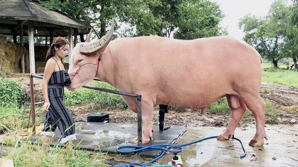 เป็นที่ฮือฮาในแวดวงควายงาม ”จ้าวออมสิน“ ควายเผือกยักษ์ กับเจ้าของสาวสวยหุ่นเซ็กซี่ ดีกรีจบปริญญาโทจากประเทศสิงคโปร์ ที่ต้องผันตัวมาเลี้ยงควายงาม