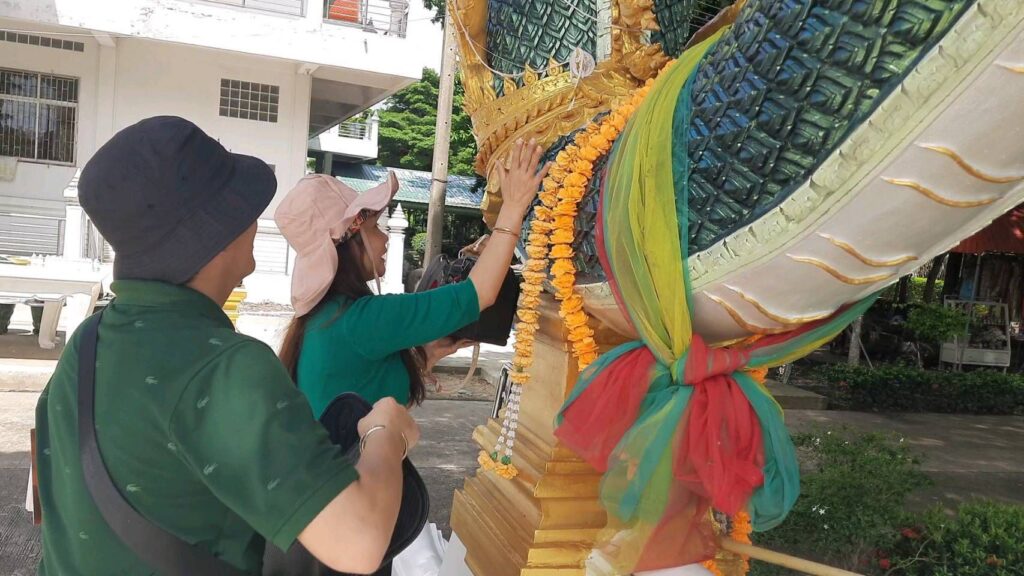 ด้านนายภูมิสิษฐ์ สิริธนาเพชร เจ้าของร้าน ตรีพัชล้านอะไหล่ ซึ่งขายของทางออนไลน์ หนึ่งในผู้มาขอพรไอ้ไข่วัดบึงบาได้กล่าวว่าตนเองนั้นเห็นข่าวในทีวีช่องหนึ่งเห็นเป็นวัดบึงบาฯอยู่ปทุมธานี มีคนเดินทางมาแก้บนและขอพรท้าวเวสสุวรรณ ไอ้ไข่วัดบึงบา กันเยอะมาก และยังได้เห็นพญานาคทั้ง2ตนที่ตั้งอยู่บนราวทางขึ้นวิหารดูสวยงามมาก ซึ่งตนเองได้เผอิญขับรถผ่านมาเส้นทางนี้พอดีจึงได้แวะเข้ามาพบว่าสวยจริง และถือโอกาสมาไหว้เพื่อขอพรกับไอ้ไข่วัดบึงบาบ้างหากโชคดีจะกลับมาแก้บนไอ้ไข่วัดบึงบาอย่างแน่นอน