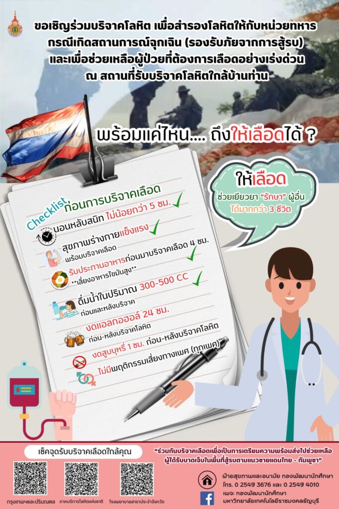 นอกจากนี้ มทร.ธัญบุรี ยังให้ความสำคัญในการสำรองโลหิตเพื่อช่วยเหลือผู้ได้รับบาดเจ็บจากสถานการณ์ชายแดน โดยได้เชิญชวนนักศึกษา บุคลากร และประชาชนทั่วไป ร่วมบริจาคโลหิตเพื่อสนับสนุนการรักษาทั้งทหารและประชาชนที่ได้รับผลกระทบ