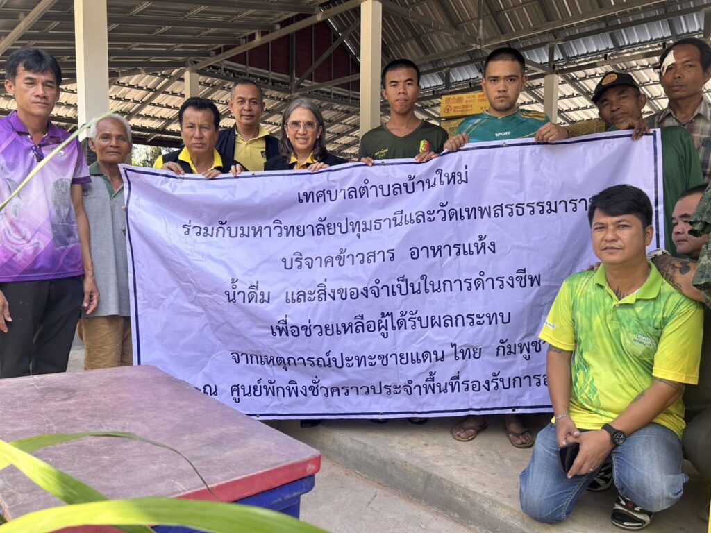 วันที่ 2 สิงหาคม พ.ศ. 2568 รศ.ดร.จิราภรณ์ ขันทอง รองอธิการบดี มหาวิทยาลัยปทุมธานี พร้อมคณะ เป็นผู้แทน ดร.ชนากานต์ ยืนยง อธิการบดีมหาวิทยาลัยปทุมธานี เดินทางไปพร้อมกับ คณะศิษยานุศิษย์ พระวัชรญาณมุนี เจ้าอาวาสวัดเทพสรธรรมาราม ดร.สมบูรณ์ ปานย้อย นายกเทศมนตรีตำบลบ้านใหม่ ในการมอบข้าวสาร อาหารแห้ง น้ำดื่ม และสิ่งของจำเป็นที่ได้รับการร้องขอจากทหาร ในการดำรงชีพ และเพื่อช่วยเหลือประชาชนผู้ได้รับผลกระทบจากเหตุการณ์ปะทะชายแดน ไทย-กัมพูชา กองกำลังทหารที่ประจำการ ณ ปราสาทตาควาย อ.พนมดงรัก จ.สุรินทร์