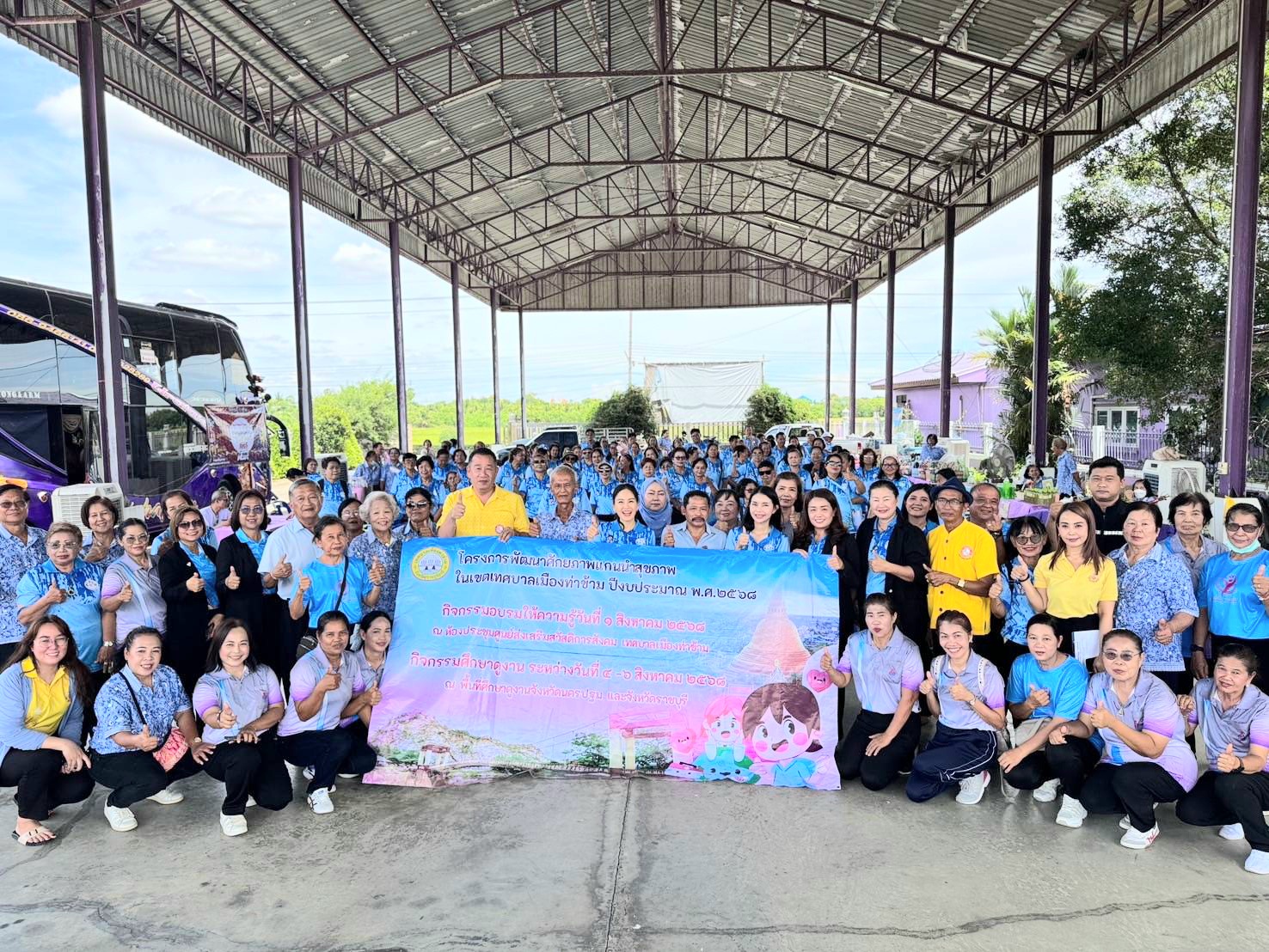 วันที่ 5 สิงหาคม 2568 เวลา 09.00 น. นายธนันชัย เอกเผ่าพันธุ์ นายกองค์การบริหารส่วนตำบลแหลมบัว นายทินกร เงินอ่อน รองปลัดองค์การบริหารส่วนตำบลแหลมบัว นายไชยวัฒน์ ศรีมารุต ผอ.รพ.สต.แหลมบัว นางสาววิภาดา ปานม่วง ผอ.กองสวัสดิการสังคม นางละออ วัฒนไพโรจน์ ประธานชมรมผู้สูงอายุตำบลแหลมบัว และอสม.รพ.สต.แหลมบัว ให้ต้อนรับคณะศึกษาดูงานเทศบาลเมืองท่าข้าม อำเภอพุนพิน จังหวัดสุราษฏร์ธานี นำโดย นางวสุ ประดิฐพร นายกเทศบาลเมืองท่าข้าม พร้อมคณะผู้บริหาร พนักงานเทศบาล พนักงานจ้างเทศบาล และแกนนำสุขภาพชุมชนในสังกัดเทศบาลเมืองท่าข้าม รวมทั้งสิ้น 90 คน ลงพื้นที่ศึกษาดูงานชมรมผู้สูงอายุตำบลแหลมบัว และเยี่ยมชมการดำเนินงานโรงเรียนผู้สูงอายุตำบลแหลมบัว การสร้างอาชีพเสริม การดูแลสุขภาพผู้สูงอายุ และแลกเปลี่ยนความรู้ซึ่งกันและกัน พร้อมทั้งเยี่ยมชมฐานการเรียนรู้ที่เป็นผลิตภัณฑ์ดีเด่นของกลุ่มอาชีพชุมชนตำบลแหลมบัว ได้แก่