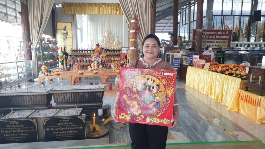 ด้านนางสาวปภัทรพร พรธณศิริ นำชุดผลไม้ 9 อย่าง น้ำดื่ม 9 แพค มาแก้บนท้าวเวสสุวรรณหลังได้รับเงินแสนกว่าบาท ส่งงานกับลูกค้าได้ตามที่หวังไว้ นางสาวปภัทรพรกล่าวว่าตนเองทำงานเกี่ยวกับการขอใบอนุญาตต่างๆ ตนจะเป็นฝ่ายประสานงานยื่นเรื่องขอใบอนุญาตให้ลูกค้า ตนจะขอพรท้าวเวสฯอยู่บ่อยครั้งและจะขอพรกับท้าวเวสฯเกี่ยวกับเรื่องงานเป็นหลัก งานก็สำเร็จลุล่วงตามที่หวัง ในแต่ละงานก็ได้รับหลักแสนบาทขึ้นไปมากสุดก็ห้าแสนกว่าบาท ซึ่งงานล่าสุดตนเองกลัวว่างานจะหลุดแล้วลูกค้าไม่โอเค ตนเองจึงอธิฐานขอพรท้าวเวสฯขณะขับรถว่าขอให้ได้งานหน่อยถ้าได้ตนจะนำผลไม้ 9 อย่าง น้ำดื่ม 9 แพคมาถวาย ผลปรากฎว่าที่อธิฐานขอพรไว้ตอนเช้า พอตอนบ่ายลูกค้าก็บอกโอเคงานแล้ว วันนี้ตนจึงนำของมาแก้บนดังกล่าว ก่อนกลับได้ล้วงลูกบอลเสี่ยงทายได้เลข 021 กลับไปลุ้นโชคอีกต่อ