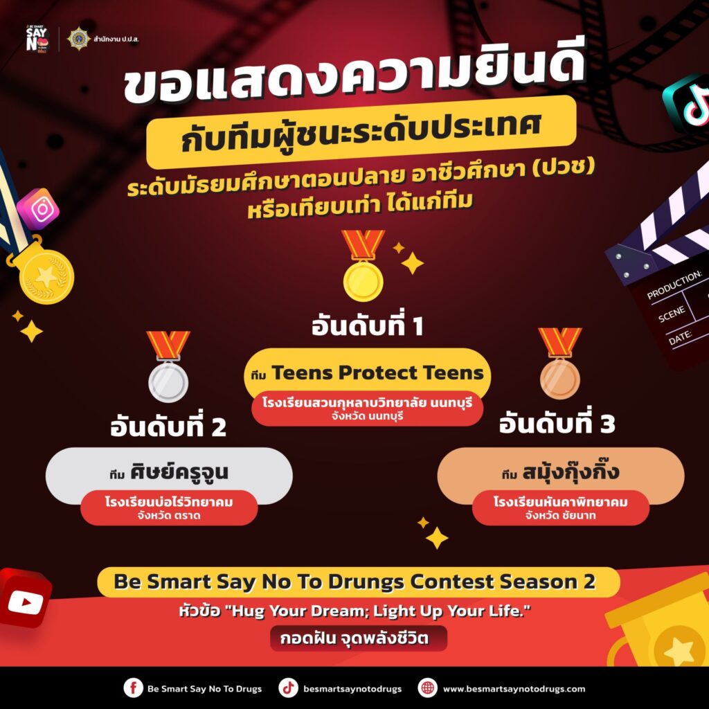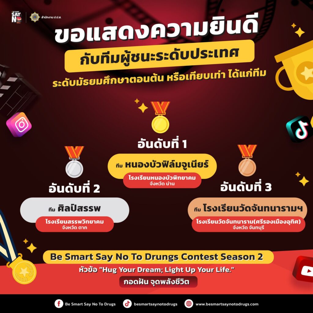 ติดตามข้อมูลเพิ่มเติมเกี่ยวกับผู้ชนะได้ที่:Facebook – Be Smart Say No to Drugs