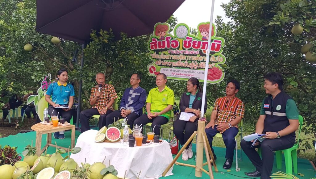 สำนักงานเกษตรจังหวัดชัยภูมิจัดงานเชื่อมโยงการผลิตและการตลาดประชาสัมพันธ์สินค้าส้มโอ สร้างความเชื่อมั่นสู่ผู้บริโภค โดยเฉพาะ “ส้มโอทองดีบ้านแท่น” สู่ตลาดที่ยั่งยืน