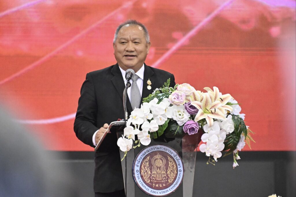 เลขาธิการ กอศ. กล่าวต่อไปว่า สอศ. ไม่หยุดนิ่งในการพัฒนาความร่วมมือร่วมภาคประกอบการ ส่งเสริมการพัฒนาครูให้ก้าวทันเทคโนโลยีที่เปลี่ยนแปลงไป โดยเฉพาะในอุตสาหกรรมใหม่ เช่น ยานยนต์ไฟฟ้า พัฒนาหลักสูตรให้ตอบโจทย์และตรงกับความต้องการเพื่อให้ผู้เรียนมีทักษะที่พร้อมทำงานได้ทันที ซึ่งการขับเคลื่อนอาชีวศึกษาระบบทวิภาคี สอศ. ได้ดำเนินความร่วมมือกับภาคีเครือข่ายแล้วกว่า 20,000 แห่ง อย่างต่อเนื่องกว่า 10 ปี โดยผู้เรียนอาชีวะจะได้รับทักษะที่ตรงกับความต้องการ มีรายได้ระหว่างเรียน ที่สำคัญคือจบแล้วมีงานทำ 100% แน่นอน โดย สอศ. พร้อมที่จะสนับสนุนและขับเคลื่อนการทำงานร่วมกับทุกภาคส่วนเพื่อส่งต่อกำลังคนอาชีวศึกษาที่มีคุณภาพสู่ภาคประกอบการ และเป็นกำลังสำคัญในการขับเคลื่อนเศรษฐกิจของประเทศให้เติบโตอย่างยั่งยืน