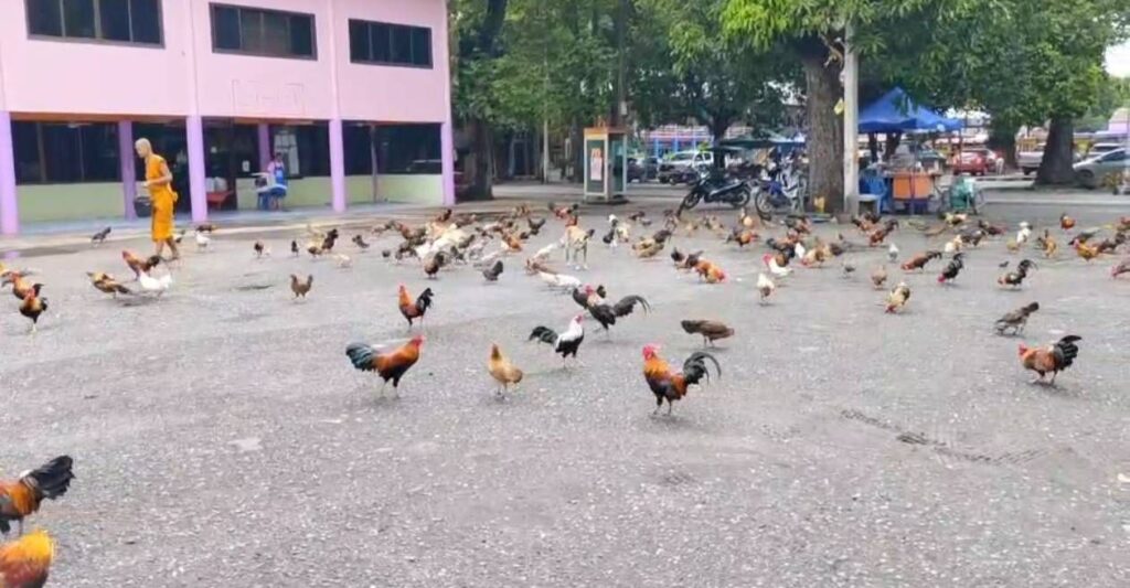 ที่นครนายกผู้สื่อข่าวรายงานว่าบริเวณวัดกุฎีเตี้ย ตำบลอาสา อำเภอบ้านนา จังหวัดนครนายก ได้มีไก่แจ้จำนวนมากเดินอยู่บริเวณลานวัดจิกหาอาหารกินตามประสาไก่แต่พอถึงเวลาหลวงตาได้นำข้าวเปลือกมาหว่านให้ไก่แจ้ทั้งหมดได้กินกันปรากฏว่าภาพที่เห็นนั้นเป็นภาพที่น่าประทับใจเป็นอย่างมากที่มีไก่แจ้หลายร้อยตัวออกมาจิกกินข้าวเปลือกที่หลวงตานั้นหว่านให้รวมถึงหมา 5 ตัวที่ไม่กัดและไม่ทำอะไรไก่เลยแม้แต่นิดเดียว เมื่อก่อนนี้หมาก็เยอะเหมือนกันมีคนมาตอนให้บ้างก็เลยไม่ค่อยมีหมาสักเท่าไหร่ ตอนนี้ก็มีแต่ไก่เยอะแทน