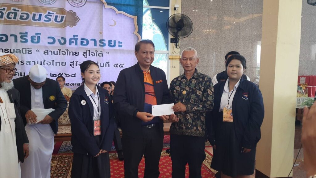 วันที่ 14 ตุลาคม 68 ผู้สื่อข่าวรายงานว่าที่มัสยิดลำสนุ่น ต.คลองสอง อ.คลองหลวง จ.ปทุมธานี นายอารีย์ วงศ์อารยะ ประธานในพิธี และคณะกรรมการดำเนินการโครงการโครงการ “สานใจไทย สู่ใจใต้” รุ่นที่ 45 ได้เดินทางมาตรวจเยี่ยมครอบครัวอุปถัมภ์ ตามโครงการฯ โดยมี นายเอกวิทย์ มีเพียร ผู้ว่าราชการจังหวัดปทุมธานี น.ส.อภิสรา เกษอินทร์ นายอำเภอคลองหลวง และ นายสุเทพ วงษ์แจ้ง นายกเทศมนตรีเมืองท่าโขลง ร่วมให้การต้อนรับ