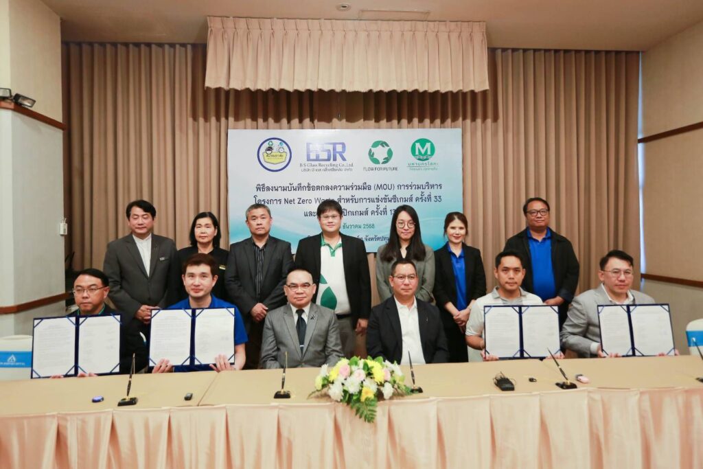 จากนั้นช่วงบ่ายพันธมิตรได้ร่วมกันเซ็นต์ MOU ระหว่างสมาคมฯบริษัท โฟลว์ ฟอร์ ฟิวส์เจอร์ จำกัด และพันธมิตรบริษัท บี เอส กล๊าสรีไซเคิล จำกัดและบริษัท มหานคร เมททอลสแครป จำกัด ในโครงการ Net Zero Waste แข่งขัน SEA Games