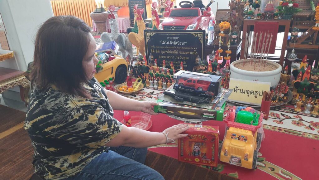 ด้านนางสาวอรนุช โชครัศมีดาว หนึ่งในผู้ตามรอยข่าวพร้อมครอบครัวเดินทางมาจากย่านหนองจอก นำเครื่องเซ่นไหว้มาขอพรสิ่งศักดิ์สิทธิ์ภายในวัดบึงบาฯ