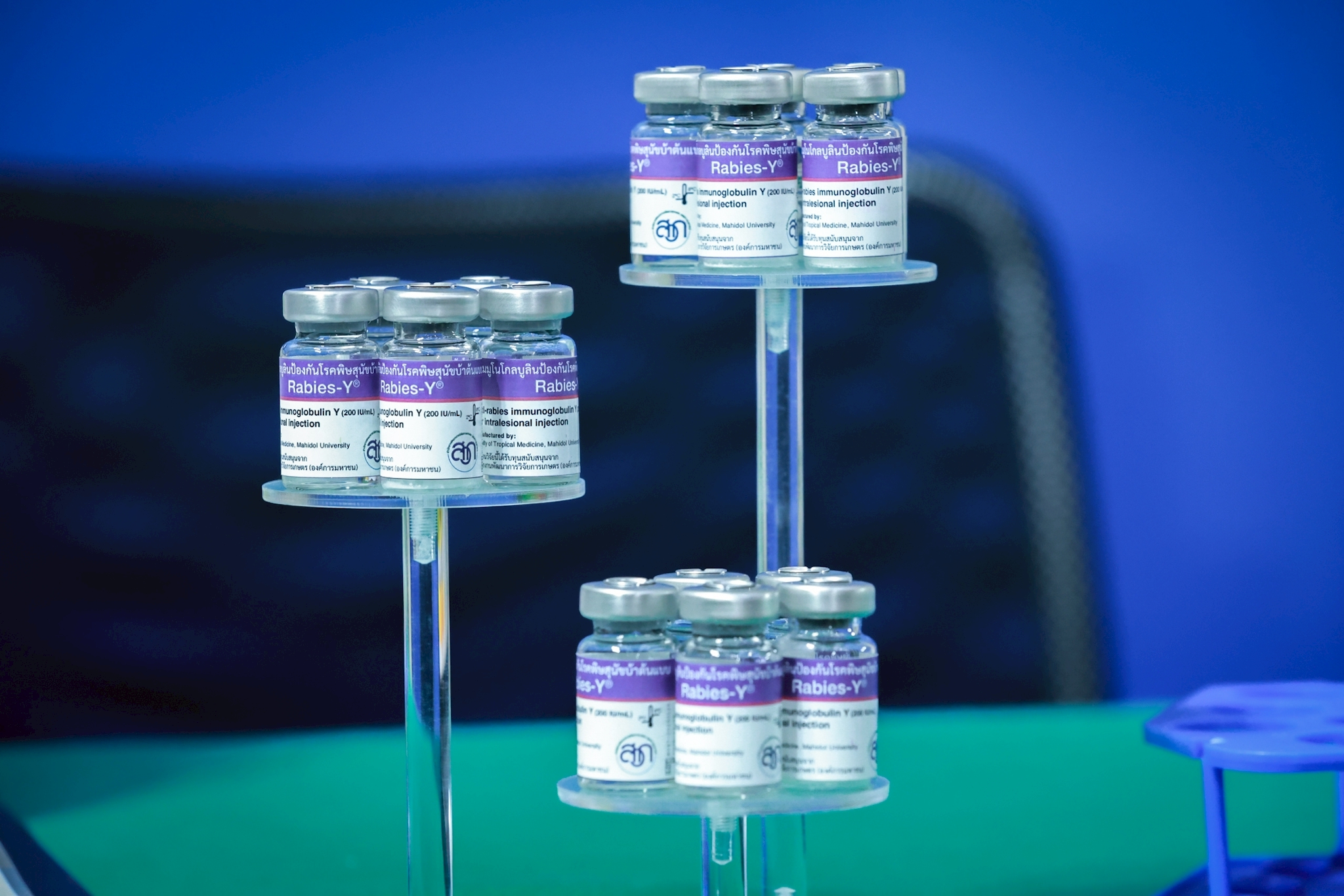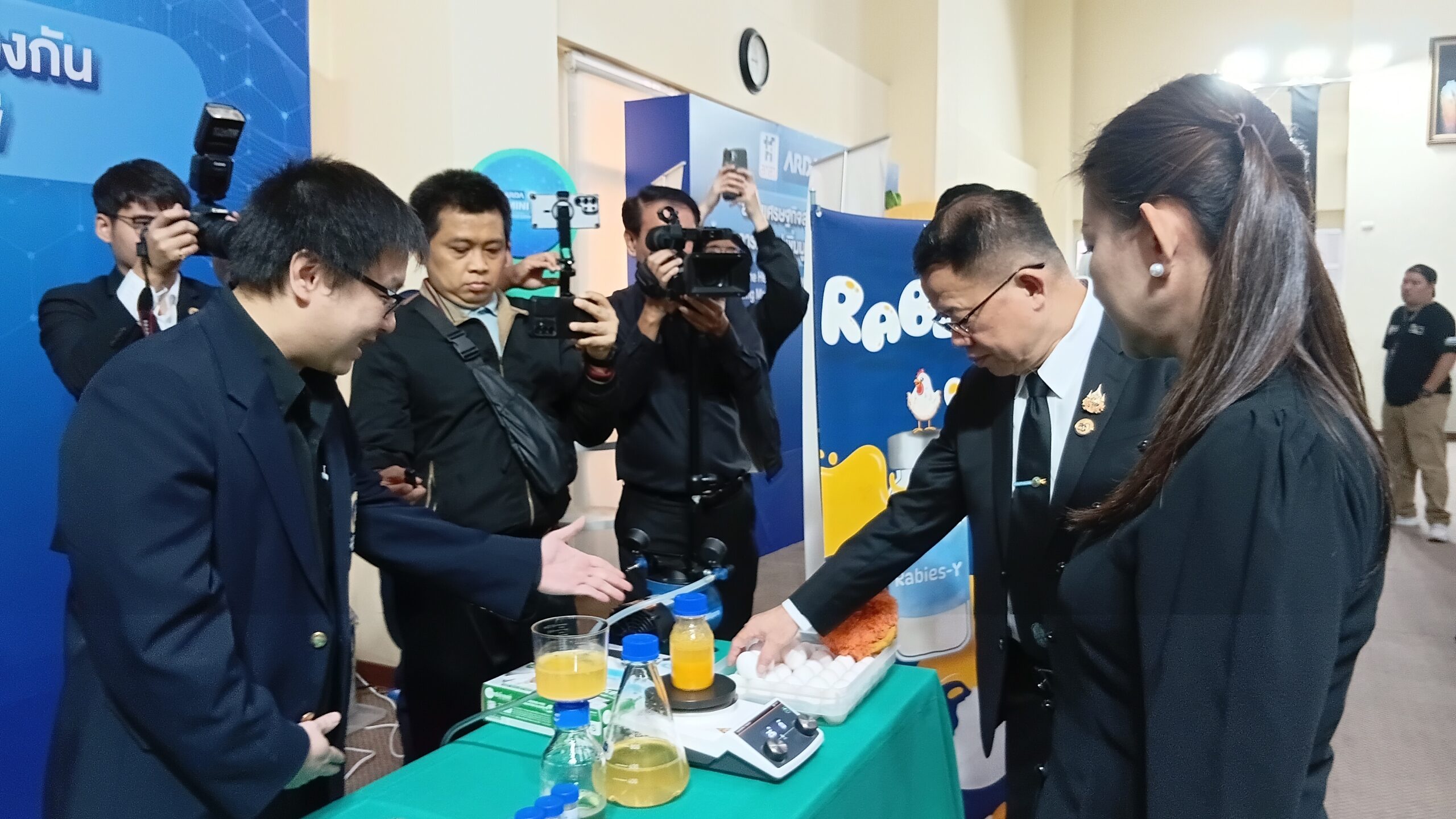 นายชรินทร์ ถาวรคุโณ หัวหน้าโครงการวิจัยฯ กล่าวว่า งานวิจัยนี้พัฒนาเทคโนโลยีการผลิตอิมมูโนโกลบูลินป้องกันโรคพิษสุนัขบ้าจากไก่ไข่ปลอดเชื้อเฉพาะ (SPF) แทนการใช้เลือดม้า โดยเริ่มจากการฉีดวัคซีนป้องกันโรคพิษสุนัขบ้าให้ไก่ที่เลี้ยงในโรงเรือนระบบปิด จากนั้นนำไข่ที่ได้มาสกัดอิมมูโนโกลบูลินเพื่อนำไปใช้ทางการแพทย์ ผลการผลิตสารกัดจากไก่ไข่ภายใต้โครงการวิจัยสามารถลดต้นทุนต่อขวดจาก 700-800 บาท เหลือประมาณ 350 บาท ใช้ไข่เพียง 7 ฟองต่อการผลิต 1 ขวด และสามารถรองรับความต้องการวัคซีนของประเทศประมาณ 100,000 ขวดต่อปีได้ด้วยไก่เพียง 2,000-4,000 ตัว ช่วยลดการพึ่งพาวัตถุดิบจากสัตว์ขนาดใหญ่ และลดความเสี่ยงจากการขาดแคลนในภาวะวิกฤติ ปัจจุบันโครงการอยู่ในระดับการผลิตเชิงทดลองด้วยไก่ 36 ตัว เลี้ยงในระบบที่ควบคุมเชื้อโรคมากกว่า 30 ชนิด มีกำลังการผลิตประมาณ 1,500 ขวดต่อปี และอยู่ระหว่างการยกระดับโรงเรือนและกระบวนการผลิตสู่มาตรฐานอุตสาหกรรม หากขยายผลได้เต็มศักยภาพ จะช่วยเสริมความมั่นคงทางสุขภาพของประเทศ ลดต้นทุนระบบสาธารณสุข และเปิดโอกาสให้ไทยก้าวสู่ตลาดอิมมูโนโกลบูลินโลกที่มีมูลค่ามากกว่า 500 ล้านดอลลาร์สหรัฐต่อปี โดยมีเป้าหมายผลิตยาคุณภาพดีให้กับประชาชนทั้งประเทศ