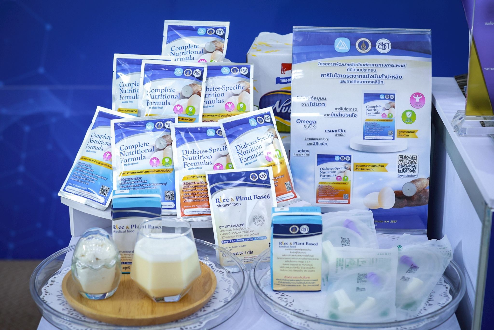 ผศ.ดร.สุภัทร์ ไชยกุล หัวหน้าโครงการวิจัยฯ กล่าวว่า คณะวิจัยพัฒนาอาหารทางการแพทย์จาก “น้ำนมผสมข้าว” นวัตกรรมจากนักวิจัยไทยรายแรก เพื่อใช้เป็นอาหารพร้อมบริโภคและอาหารทางสายให้อาหาร ที่มีคุณค่าทางโภชนาการครบถ้วนตามมาตรฐานสากล และสามารถทดแทนอาหารทางการแพทย์นำเข้า มูลค่ากว่า 300-500 ล้านบาทต่อปี นวัตกรรมนี้ยกระดับวัตถุดิบเกษตรไทย โดยเพิ่มมูลค่าข้าวกล้องส่วนเหลือจากการขัดสี จาก 10-20 บาท เป็น 180-200 บาทต่อกิโลกรัม ควบคู่กับการแก้ปัญหาน้ำนมล้นคลัง ด้วยการใช้น้ำนมโคถึง 40% ของส่วนผสมทั้งหมด ปัจจุบันผลิตได้ในระดับอุตสาหกรรม ได้รับการรับรองจาก อย. และจดอนุสิทธิบัตรแล้ว 2 สูตร ได้แก่ สูตรครบถ้วนปราศจากแลคโตส และสูตรน้ำนมปกติที่ใช้ข้าวกล้องเป็นแหล่งคาร์โบไฮเดรตหลัก ผลทดสอบทางคลินิกยืนยันค่าดัชนีน้ำตาลต่ำ (GI 20-28) ช่วยควบคุมระดับน้ำตาลและไขมันในเลือดได้อย่างมีนัยสำคัญ ขณะนี้ อ.ส.ค.ผลิตและจำหน่ายกว่า 345,600 กล่องต่อปี สร้างรายได้มากกว่า 10 ล้านบาทต่อปี และเพิ่มรายได้ให้เกษตรกรปลูกข้าว อ้อย และโคนมได้กว่า 725,760 บาทต่อปี เติบโตถึง 600% สะท้อนงานวิจัยที่เชื่อมเกษตร-สุขภาพ-เศรษฐกิจได้อย่างเป็นรูปธรรม