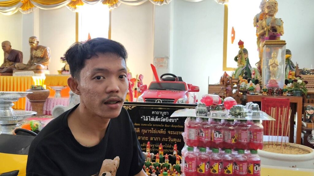 ส่วนทางด้านนายศุภโชค น้ำทิพย์ นำชุดเครื่องสำอางมาถวายแก้บนแม่ตะเคียนทองหลังได้รับโชคในงวดที่ผ่านมานายศุภชัยกล่าวว่าตนมาที่วัดบึงฯเป็นครั้งที่ 2 แล้วซึ่งก่อนหน้านี้ตนได้เห็นกระแสความศรัทธาผ่านสื่อสังคมออนไลน์ ในโซเชียลต่างๆ ทั้งทีวี เพจข่าวและTikTok ที่มีการแชร์ต่อกันอย่างกว้างขวางว่าหากใครได้เดินทางมาสักการะและขอพรกับท้าวเวสสุวรณ ไอ้ไข่วัดบึงบา แม่ตะเคียนทองที่วัดบึงบาฯแล้วจะสมหวังในเรื่องที่ขอพรไว้มาหลายราย ตนจึงได้เดินทางมาขอพรกับท้าวเวสฯ ไอ้ไข่วัดบึงบา และแม่ตะเคียนทองเป็นครั้งแรก แล้วได้จุดธูปนำเลขไปซื้อล็อตเตอรี่แล้วผลปรากฏว่าตนก็ได้รับโชคถูกล็อตเตอรี่มา7 ใบในงวดที่ผ่านมา และวันนี้ตนก็มาแก้บนและขอพรใหม่เป็นครั้งที่ 2 และก่อนกลับยังได้จุดธูปขอเลขมงคลได้เลข 057 เพื่อนำไปซื้อลอตเตอรี่ในงวดถัดไป