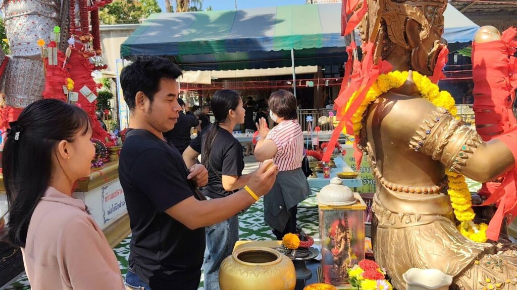 ทางด้าน นางสาววรรณวิมล สิงหาญ เดินทางมาจากจังหวัดชลบุรี นำข้าวสารจำนวน 9 ถุง พร้อมเครื่องเซ่นไหว้ เข้ามาแก้บนองค์ท้าวเวสสุวรรณ หลังประสบความสำเร็จสอบเข้ารับราชการท้องถิ่นได้ตามที่ตั้งใจไว้ นางสาววรรณวิมลกล่าวว่าเมื่อช่วงต้นปี 2568 ที่ผ่านมา ตนได้เดินทางมากราบไหว้ขอพรองค์ท้าวเวสสุวรรณ ว่าขอให้ตนสอบเข้ารับราชการท้องถิ่นได้สำเร็จ เนื่องจากการสอบดังกล่าวมีหลายขั้นตอน ทั้งภาค ก ความรู้ทั่วไป ภาค ข ความรู้เฉพาะตำแหน่ง และภาค ค ความเหมาะสมกับตำแหน่ง อีกทั้งยังมีผู้สมัครเข้าสอบเป็นจำนวนมาก แม้ตนจะมีความมั่นใจ แต่ก็ต้องการที่พึ่งทางใจ จึงมากราบขอพรเพื่อความสบายใจ ภายหลังจากเข้าสอบในแต่ละสนาม ปรากฏว่าสามารถสอบผ่านทุกขั้นตอน จนได้รับการบรรจุเป็นข้าราชการสมดังใจหวัง ตนเองและครอบครัวรู้สึกดีใจเป็นอย่างมาก วันนี้จึงเดินทางมาแก้บนตามที่ได้บนบานไว้และก่อนเดินทางกลับยังได้จุดธูปเสี่ยงทาย 74 ได้เลขนำกลับไปลุ้นโชคอีกครั้ง