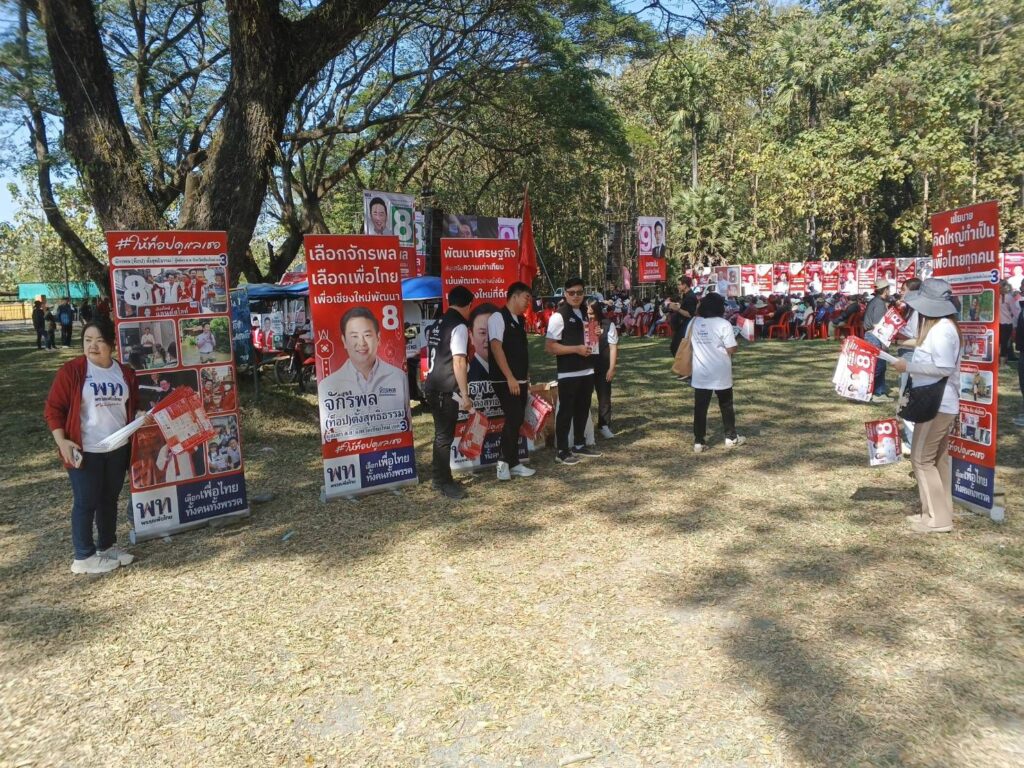 ทั้งนี้มีการตั้งเวทีปราศัย และติดป้ายหาเสียงพรรคเพื่อไทย ประกอบด้วย นายยศชนัน วงศ์สวัสดิ์ นายจุลพันธ์ อมรวิวัฒน์ นายสุริยะจึงรุ่งเรืองกิจ แคนนิเดตนายกรัฐมนตรี พรรคเพื่อไทย นายณัฐวุฒิ ไสยเกื้อ แกนนำเสื้อแดง นายจักรพล พร้อมป้ายนโยบายหาเสียงรถยนต์แห่ รถจักรยานยนต์แห่หาเสียงกว่า 20 คัน มีเจ้าหน้าที่รักษาความปลอดภัยทั้งในและนอกเครื่องแบบกว่า 20 นายและเจ้าหน้าที่ฝ่ายความมั่นคงและการข่าวกว่า 10 นาย ที่สังเกตการณ์และรายงานผู้บังคับบัญชาตามลำดับ