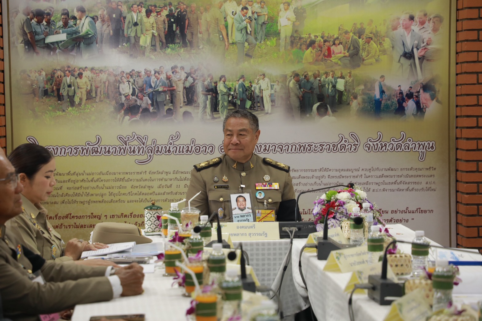 โครงการพัฒนาพื้นที่ลุ่มน้ำแม่อาวฯ เริ่มดำเนินการตั้งแต่ปี 2536 ครอบคลุมพื้นที่ประมาณ 127,058 ไร่ หรือ 204 ตารางกิโลเมตร อยู่ในเขตอำเภอป่าซาง อำเภอบ้านโฮ่ง และอำเภอเวียงหนองล่อง จังหวัดลำพูน ประกอบด้วย 32 หมู่บ้าน 6 ตำบล มีประชากร 7,855 ครัวเรือน จำนวน 20,862 คน ส่วนใหญ่ร้อยละ 74 ประกอบอาชีพเกษตรกรรม โดยปลูกลำไยเป็นอาชีพหลัก พื้นที่โครงการส่วนใหญ่มีลักษณะเป็นที่ราบและที่ราบลูกคลื่นประมาณร้อยละ 60 มีความสูงจากระดับน้ำทะเลปานกลางเฉลี่ยประมาณ 290-350 เมตร ส่วนที่เหลือเป็นพื้นที่สูงหรือทิวเขา ภูเขา และเนินเขา ซึ่งอยู่ทางตอนล่างของโครงการมีความสูงจากระดับน้ำทะเลปานกลางเฉลี่ยประมาณ 400-1,020 เมตร ซึ่งเหมาะแก่การอนุรักษ์ไว้เป็นพื้นที่ป่าต้นน้ำ โอกาสนี้ องคมนตรีรับฟังรายงานแนวทางการขับเคลื่อนกระบวนการจัดทำแผนและประสานแผนพัฒนาพื้นที่ (One Plan) มาใช้ในการขับเคลื่อนโครงการพัฒนาพื้นที่ลุ่มน้ำแม่อาวฯ พร้อมทั้งเยี่ยมชมนิทรรศการความสำเร็จของการพัฒนาคุณภาพชีวิตเกษตรกรในพื้นที่โครงการฯ จากนั้นคณะฯ ร่วมปล่อยพันธุ์ปลาลงสู่อ่างเก็บน้าห้วยโป่งอันเนื่องมาจากพระราชดำริ