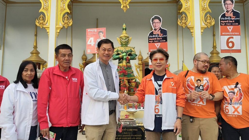 เมื่อช่วงเช้าวันนี้(26 มกราคม 69) ผู้สื่อข่าวรายงานว่าที่ตลาดนัดวัดบึงบาประภาสะวัต คลอง10 ต.บึงบา อ.หนองเสือ จ.ปทุมธานี นายยงยุทธ มั่นบุปผชาติ ผู้สมัครสมาชิกสภาผู้แทนราษฎร จังหวัดปทุมธานี เขต 8 พรรคเพื่อไทย หมายเลข 4 พร้อมทีมงานหาเสียง ได้เดินแจกใบแนะนำตัวพร้อมนโยบายผู้สมัครแก่ชาวบ้านที่มาจับจ่ายซื้อของในตลาด ปรากฏว่าได้ไปเจอกับทางด้านนายประสิทธิ์ ปัทมผดุงศักดิ์ ผู้สมัครสมาชิกสภาผู้แทนราษฎร เขต 8 ปทุมธานี เขต 8 พรรคประชาชน หมายเลข 6 พร้อมทีมงานหาเสียง ที่กำลังเดินแจกใบแนะนำตัวอยู่โดยไม่ได้นัดหมาย