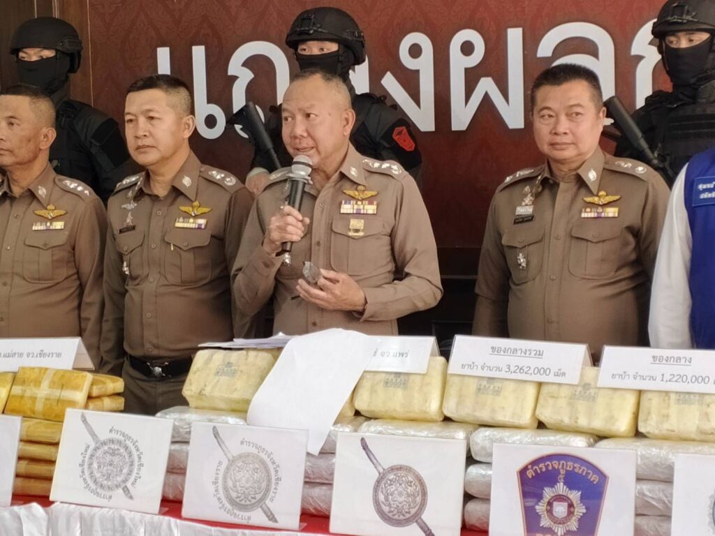 เมื่อวันที่ 28 มกราคม 2569 ที่สำนักงานตำรวจภูธรภาค 5 อ.เมือง จ.เชียงใหม่ พล.ต.ท.กฤตธาพล ยี่สาคร ผบช.ภ.5 พล.ต.ต.ธนะรัชต์ ชุ่มสวัสดิ์ รอง ผบช.ภ.5 ผู้แทน นบ.ยส 35 ปปส.ภาค 5 ปกครอง จ. เชียงราย และเชียงใหม่ ร่วมแถลงข่าวผลการจับกุมคดียาเสพติดรายสำคัญ 3 คดี ผู้ต้องหา 5 คน ของกลางยาบ้า รวม 3,262,000 เม็ด