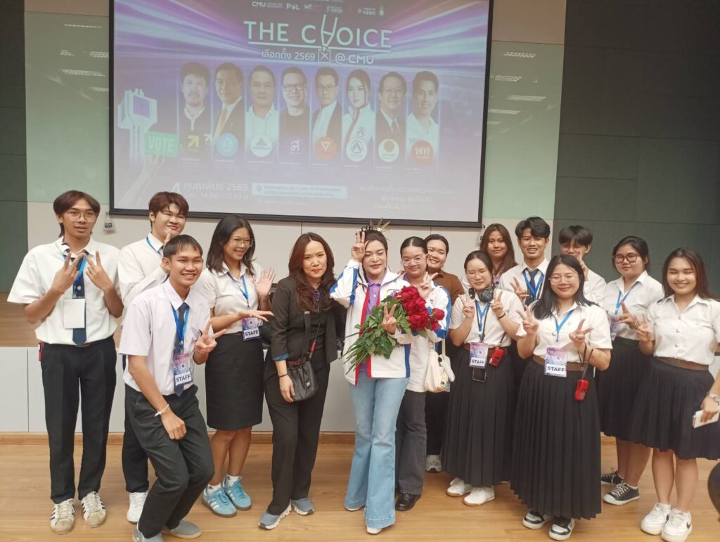 เสวนา The Choice เลือกตั้ง 2569@CMU ก่อนเลือกตั้งวันที่ 8 กุมภาพันธ์นี้ ซึ่งมีผู้แทนจาก 8 พรรค การเมืองเข้าร่วม ประกอบด้วยแคนดิเดตนายกรัฐมนตรี 5 คน และผู้แทนพรรคอีก 3 คน สะท้อนบรรยากาศการแข่งขันทางนโย บายช่วงโค้งสุดท้ายอย่างเข้มข้น ท่ามกลางความสนใจคณาจารย์ นักศึกษา บุคลากร และประชาชนที่เข้าร่วมรับฟังและแลกเปลี่ยนความคิดเห็นกว่า 500 คน