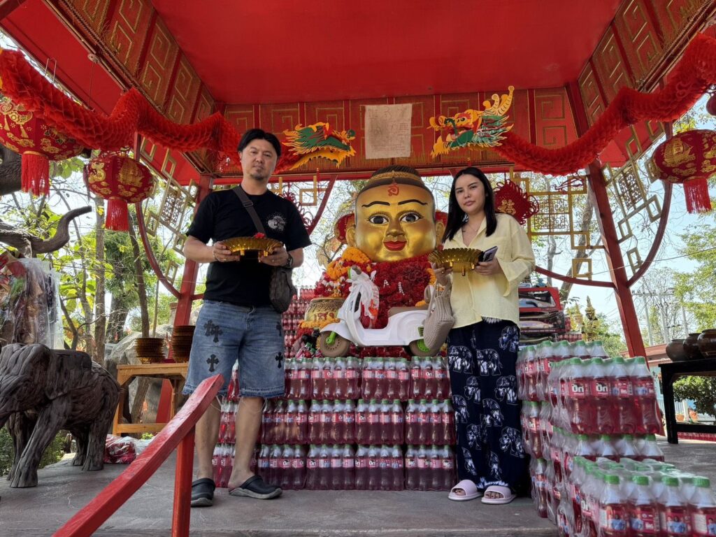 น.ส.นัยน์ณภัค พัฒนฐานิศร์ อายุ 33 ปี ชาว กทม. ที่เดินทางมาพร้อมครอบครัวเพื่อนำ รถมอเตอร์ไซค์ไฟฟ้าสำหรับเด็ก มาถวายแก้บนให้แก่ กุมารทองเจ้าสัวเฮง โดยเล่าว่า เดินทางมาที่นี่เป็นรอบที่ 3 แล้วค่ะ ล่าสุดมาขอพรให้การเทรดหุ้นประสบความสำเร็จ ได้กำไรตามเป้า 5,000 เหรียญ หรือประมาณ 180,000 บาท เมื่อได้สมความปรารถนาจึงรีบซื้อของมาแก้บนตามที่สัญญาไว้