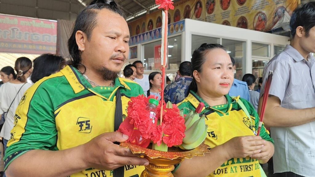 ทางด้านนายฝน (ชื่อเล่น) ได้นำน้ำแดง 1 แพคพร้อมด้วยเครื่องเซ่นไหว้มาแก้บนหลังมีโชคถูกรางวัลในงวดที่ผ่านมา นายฝนกล่าวว่าตนเองเป็นพนักงานขับรถรับจ้าง วันนี้ตนได้ตั้งใจเดินทางมาเพื่อแก้บนกับองค์ท้าวเวสสุวรรณ หลังจากก่อนหน้านี้เคยเดินทางมากราบไหว้ขอพรเรื่องโชคลาภเป็นครั้งแรก โดยในครั้งนั้นได้ตั้งจิตอธิษฐานขอให้มีโชคลาภและความสำเร็จในเรื่องการงาน ซึ่งหลังจากนั้นไม่นานก็ปรากฏว่าตนได้รับโชคตามที่หวังไว้ ทำให้เกิดความรู้สึกศรัทธาและประทับใจเป็นอย่างมาก จึงตั้งใจกลับมาอีกครั้งเพื่อทำตามคำสัญญาที่เคยให้ไว้ นายฝนกล่าวเพิ่มเติมว่า การมาครั้งนี้นอกจากจะมาแก้บนตามที่ตั้งใจไว้แล้ว ยังได้ตั้งจิตอธิษฐานขอพรเพิ่มเติมในเรื่องของชีวิตและความเป็นอยู่ โดยเฉพาะเรื่องสุขภาพร่างกาย เนื่องจากอาชีพขับรถรับจ้างต้องใช้ร่างกายอย่างหนักในแต่ละวัน หากมีสุขภาพแข็งแรงก็จะสามารถทำงานหาเลี้ยงครอบครัวได้อย่างต่อเนื่องและมั่นคง พร้อมยืนยันว่าหากมีโอกาสก็จะเดินทางมากราบไหว้อีกในอนาคต และก่อนกลับได้จุดธูปมงคลได้เลข 91 นำกลับไปลุ้นครั้งที่ 2 ต่อไป