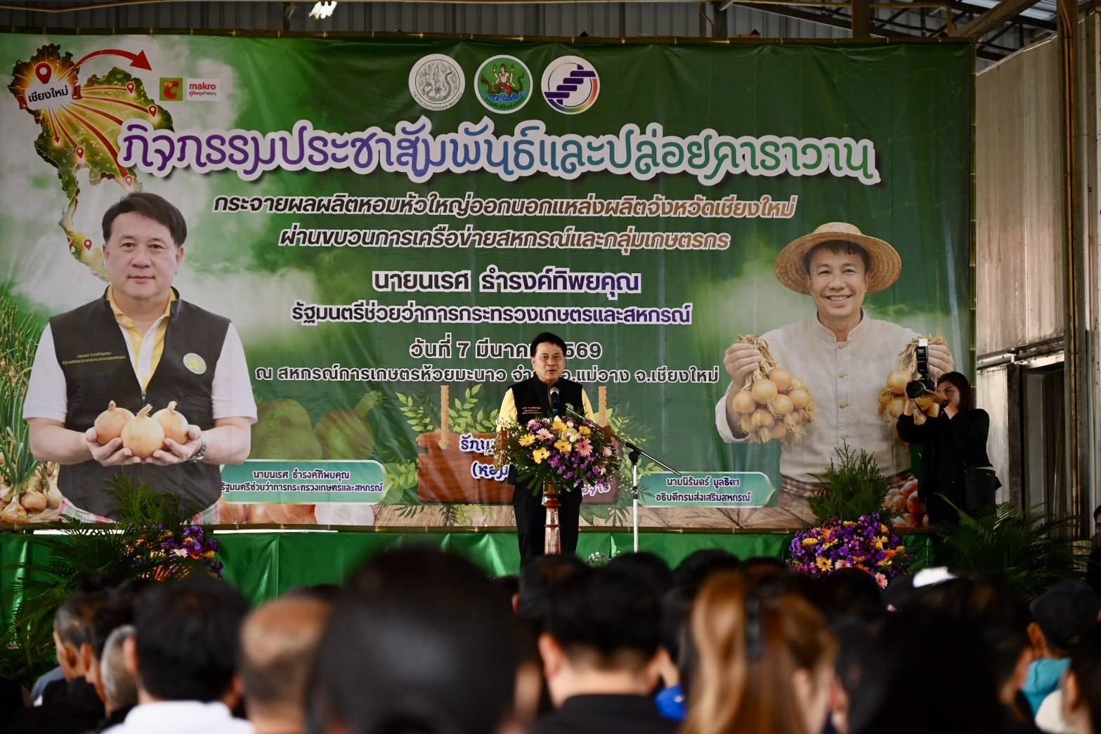 วันที่ 7 มี.ค.2569 นายนเรศ ธำรงค์ทิพยคุณ รัฐมนตรีช่วยว่าการกระทรวงเกษตรและสหกรณ์ เป็นประธานในพิธีปล่อยคาราวานหอมหัวใหญ่ กิจกรรมกระจายผลผลิตหอมหัวใหญ่ออกนอกแหล่งผลิตภายใต้แคมเปญ “รักนะจึงให้หอม (หอมหัวใหญ่) เชียงใหม่เน้อจ้าว” จำนวน 12 คัน สู่ตลาดปลายทางทั่วประเทศ กระจายผลผลิตหอมหัวใหญ่คุณภาพดีจากแหล่งผลิตสู่ผู้บริโภคอย่างทั่วถึง บรรเทาปัญหาผลผลิตล้นตลาด สร้างรายได้ และยกระดับคุณภาพชีวิตของสมาชิกสหกรณ์และเกษตรกรผู้ปลูกหอมหัวใหญ่ ณ สหกรณ์การเกษตรห้วยมะนาว จำกัด ตำบลดอนเปา อำเภอแม่วาง จังหวัดเชียงใหม่ โดยมี นายนิรันดร์ มูลธิดา อธิบดีกรมส่งเสริมสหกรณ์ คณะผู้บริหารกรมส่งเสริมสหกรณ์ หัวหน้าส่วนราชการ ขบวนการสหกรณ์ และเกษตรกรในพื้นที่อำเภอแม่วาง และสันป่าตองเข้าร่วมกิจกรรมดังกล่าว