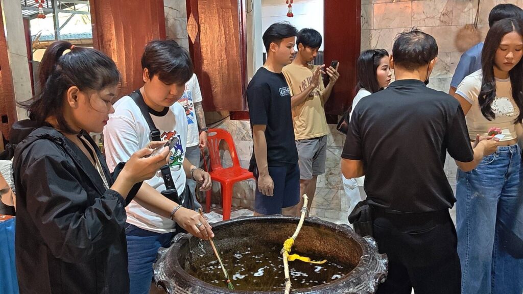 ชาวบ้านลอดท้องช้างเสริมดวงชะตา สายบุญสายมูและคอหวย ลุ้นกันตัวโก่งส่งเลขอ่างน้ำมนต์หลวงพ่อปากแดงเสี่ยงโชค