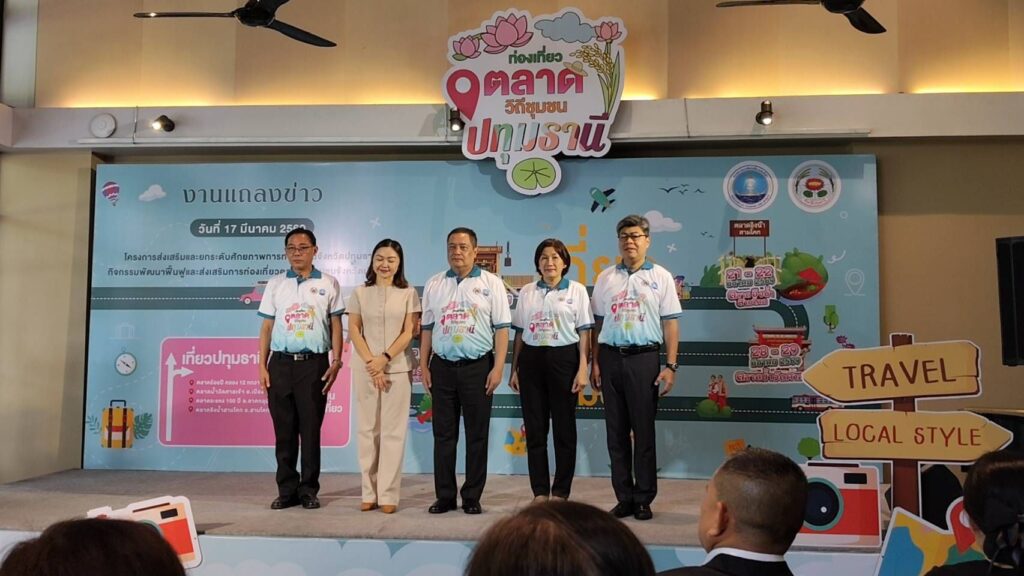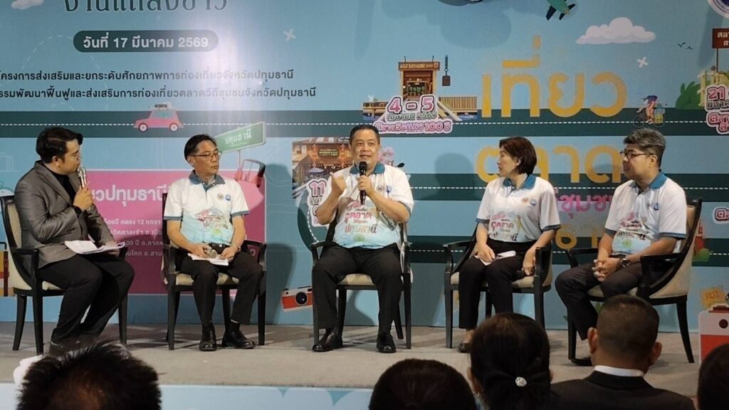 วันนี้ (17 มี.ค.69) เวลา 13.30 น. ผู้สื่อข่าวรายงานว่า ที่ โรงแรมทินิดี บางกอก กอล์ฟ คลับ อำเภอเมืองปทุมธานี จังหวัดปทุมธานี นายเอกวิทย์ มีเพียร ผู้ว่าราชการจังหวัดปทุมธานี เป็นประธานแถลงข่าวโครงการพัฒนาศักยภาพและยกระดับการท่องเที่ยวจังหวัดปทุมธานี กิจกรรมพัฒนาฟื้นฟูและส่งเสริมการท่องเที่ยวตลาดวิถีชุมชนจังหวัดปทุมธานี พร้อมด้วยนางสาวแสงจันทร์ แก้วประทุมรัสมี ท่องเที่ยวและกีฬาจังหวัดปทุมธานี นายคเชนทร์ชัย แพงจันทร์ พัฒนาการจังหวัดปทุมธานี นายอภิรัตน์ ทวีทรัพย์ รองผู้อำนวยการการท่องเที่ยวแห่งประเทศไทย สำนักงานกรุงเทพมหานคร เข้าร่วมแถลงข่าว โดยมีหัวหน้าส่วนราชการ เครือข่ายท่องเที่ยวและกีฬาจังหวัดปทุมธานี และหน่วยงานที่เกี่ยวข้องเข้าร่วมงาน