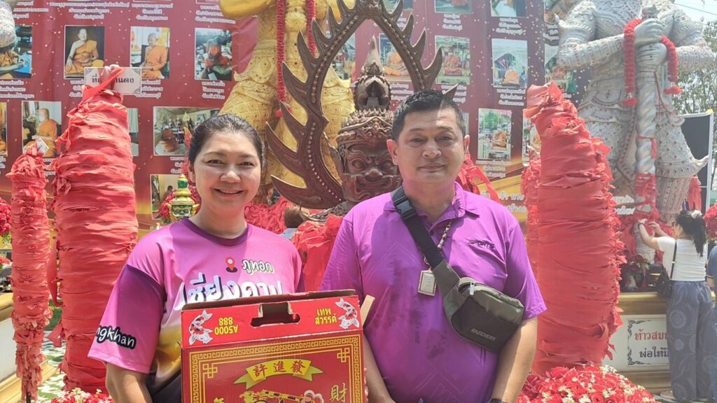 ด้านนายวราวุฒิ นางสาวศศิธร พฤกษวัน นำประทัด 5,000 นัดพร้อมด้วยเครื่องเซ่นไหว้มาแก้บนท้าวเวสสุวรรณหลังขายบ้านราคากว่าล้านได้สำเร็จ นายวราวุฒิและนางสาวศศิธรกล่าวว่าตนทั้ง 2 คนมาแก้บนท้าวเวสสุวรรณหลังจากประสบความสำเร็จในเรื่องหน้าที่การงาน ซึ่งตนทำงานที่บริษัทTS HAPPYHOME เป็นพนักงานขายบ้านหรือเซลล์ขายบ้านที่รีโนเวทเสร็จแล้วในย่านคลองแปด รังสิต-นครนายก ซึ่งก่อนหน้านี้ตนได้มาขอพรกับองค์ท้าวเวสสุวรรณไว้ว่าหากสามารถปิดการขายบ้านและโอนบ้านให้ลูกค้าได้สำเร็จตนก็จะกลับมาจุดประทัดถวายให้ท่าน