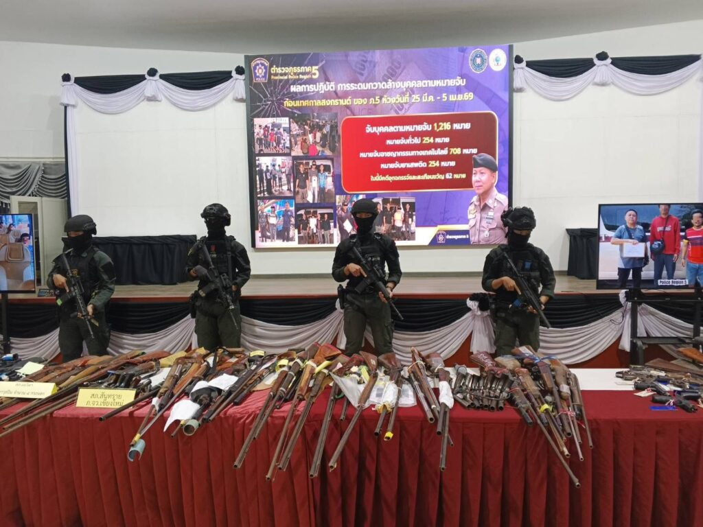 เมื่อวันที่ 9 เมษายน 2569 ที่สำนักงานตำรวจภูธรภาค 5 อ.เมือง จ.เชียงใหม่ พล.ต.ท.กฤตธาพล ยี่สาคร ผบช.ภ.5 เป็นประธานแถลงข่าวการระดมกวาดล้างอาชญากรรมเป้าหมายผู้กระทำความผิดเกี่ยวกับอาวุธปืนและเครื่องกระสุนและการสืบสวนจับกุมบุคคลตามหมายจับคดีอาญา ในห้วงก่อนเทศกาลสงกรานต์ (25 มี.ค. – 5 เม.ย. 69) มี พล ต.ท.นพดล กรึงไกร ผู้ทรงคุณวุฒิพิเศษ ตร. พล.ต.ต.ธวัชชัย พงษ์วิวัฒน์ชัย รอง ผบช.ภ.5 พล.ต.ต.ยุทธนา แก่นจันทร์ ผบก.ภ.จว.เชียงใหม่ โดบนำอาวุธปืนเครื่องกระสุน และระเบิด ที่ยึดได้มาแสดงกว่า 200 รายการ