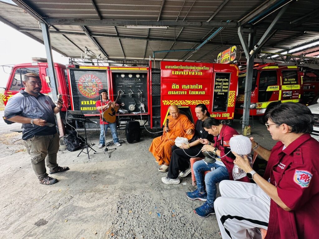 โดยมี “ตู้ ดิเรก อมาตยกุล” มาสร้างสีสัน ร้องเพลง “กู้ภัยลืมใจ”ให้กำลังใจเจ้าหน้าที่กู้ภัย จิตอาสา และยังมี “เขาทราย แกแล็คซี่” ตำนานแชมป์โลกซ้ายทะลวงไส้ ศิลปินนักร้อง เก้ากรุงเก่า มาร่วมสร้างสีสัน หลังเสร็จพิธี พระอาจารย์แดง ได้แจกวัตถุมงคล ท้าวเวสสุวรรณ ประพรหมน้ำมนต์ ให้เจ้าหน้าที่กู้ภัย และประชาชนที่เดินทางสัญจรผ่าน นอกจากนี้ ชัช ตลาดไท ยังได้ซื้อสลากกินแบ่งรุฐบาล ให้กับผู้ที่ร่วมในพิธีด้วย