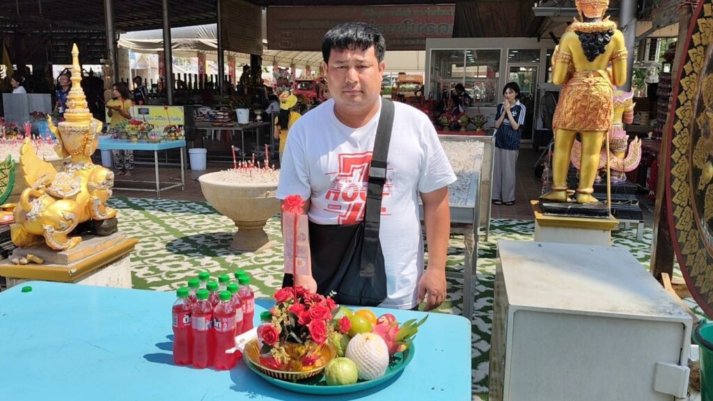 ด้านนายจักรพงษ์ ยอดเงิน นำผลไม้ 9 อย่าง น้ำแดง 9 ขวด พร้อมด้วยเครื่องเซ่นไหว้มาแก้บนท้าวเวสสุวรรณหลังเงินกู้ 2 แสนบาทผ่านสมดังใจ นายจักรพงษ์กล่าวว่าตนเองเป็นเจ้าของร้านอาหารตามสั่งชื่อร้านครัวอร่อย ย่านฟิวส์เจอร์ปาร์ครังสิต ซึ่งตนได้เห็นรูปท้าวเวสสุวรรณผ่านทางโซเชียลมีเดีย จึงเกิดความศรัทธาและได้อธิษฐานจิตทางออนไลน์ว่า หากตนเองได้รับเงินก้อนตามที่หวังไว้ จะเดินทางมาแก้บนที่วัดแห่งนี้ด้วยตนเอง หลังจากนั้นไม่นานทางธนาคารก็ได้อนุมัติเงินก้อนดังกล่าวเรียบร้อยแล้ว ทำให้สามารถนำเงินไปต่อยอดซึ่งตนตั้งใจจะนำไปต่อยอด โดยมีแผนจะเปิดร้านอาหารตามสั่ง ขยายกิจการจากเดิมที่มีเพียงหน้าร้านแบบซื้อกลับบ้าน ให้กลายเป็นร้านที่มีโต๊ะนั่งรับประทาน เพื่อรองรับลูกค้าได้มากขึ้น สร้างบรรยากาศให้น่านั่งและเพิ่มโอกาสในการขาย และจะขายทางออนไลน์ควบคู่กันไป เพื่อเพิ่มช่องทางรายได้และเข้าถึงลูกค้าได้หลากหลายมากยิ่งขึ้น วันนี้ตนจึงเดินทางมาแก้บนดังกล่าวและก่อนกลับยังได้จุดธูปเสี่ยงทายได้เลข 36 นำกลับไปลุ้นโชคอีกต่อด้วย