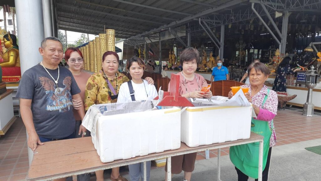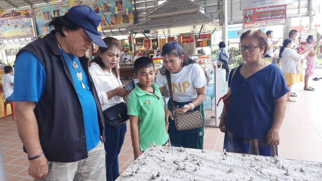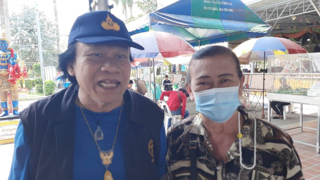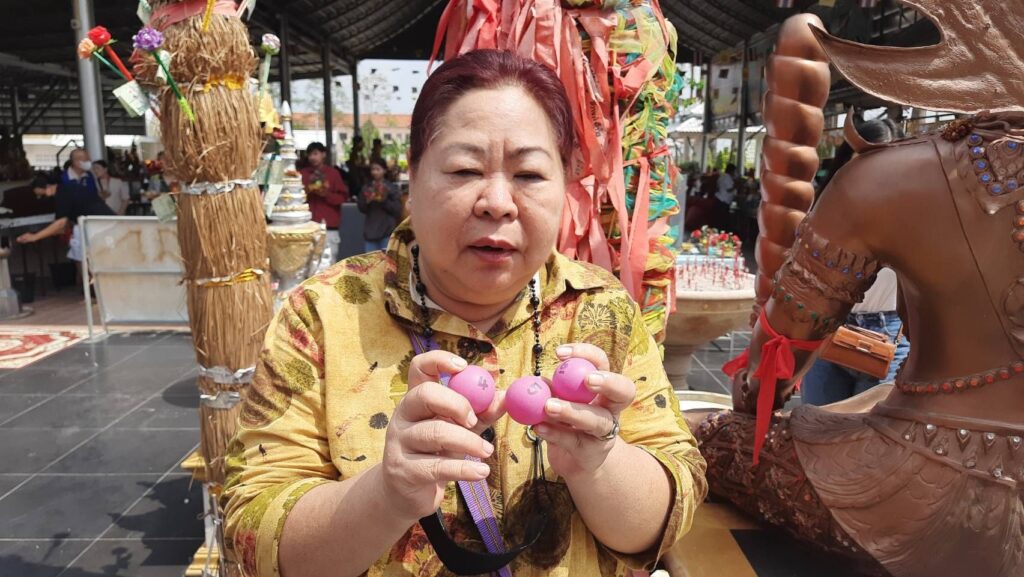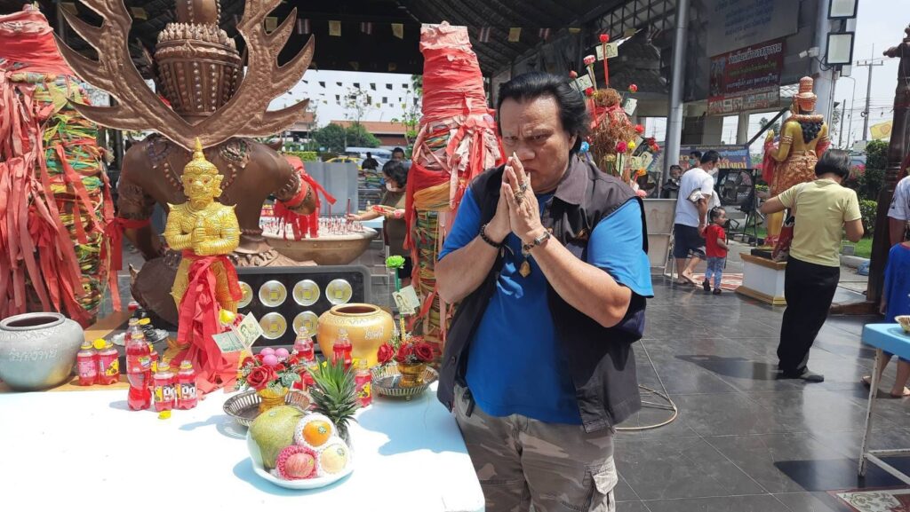 ส่วนด้านนายถนอม จันทร์ศิริ พร้อมครอบครัว เดินทางมาจากย่านรามอินทราแขวงสามวาตะวันตก เขตคลองสามวา กรุงเทพมหานคร นำผลไม้ 5 อย่าง พร้อมด้วยเครื่องเซ่นไหว้มาแก้บนท้าวเวสสุวรรณหลังได้โชคก้อนโตกว่าครึ่งแสน นายถนอมกล่าวว่าตนเองนั้นได้มาขอพรท้าวเวสสุวรรรไว้เมื่อวันก่อนหวยออก และตนเองก็ถูกรางวัลมาแล้ว 3 งวดติดจากการที่มาขอพรท้าวเวสสุวรรณ และในงวดล่าสุดตนเองนั้นล็อตเตอรี่รางวัลที่ 4 จำนวน 2 ใบ และ 2 ตัวล่าง 78 อีก 2 ใบรวมเงินแล้วเกือบครึ่งแสนรู้สึกดีใจเป็นอย่างมากและศัทธาท้าวเวสสุวรรณเป็นอย่างมาก และงวดนี้ได้จุดธูปเสี่ยงทายได้เลข 812 และของแฟนได้เลข 69 สร้างความประหลาดใจเป็นอย่างมากเพราะมันตรงกับตรงทะเบียนรถป้ายแดง 69 ที่เพิ่งออกมาได้เมื่อวาน